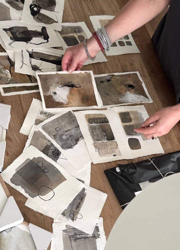 The size of the artwork is A5 (14,8 x 21cm.) and it’s made with acrylic paint and ink and old paper on cotton paper. The colours are taupe-brown and greyish.