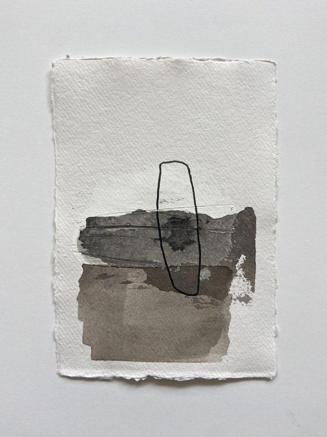 The size of the artwork is A5 (14,8 x 21cm.) and it’s made with acrylic paint and ink and old paper on cotton paper. The colours are taupe-brown and greyish.