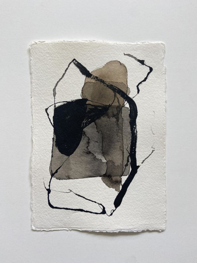 The size of the artwork is A5 (14,8 x 21cm.) and it’s made with acrylic paint and ink and old paper on cotton paper. The colours are taupe-brown and greyish.