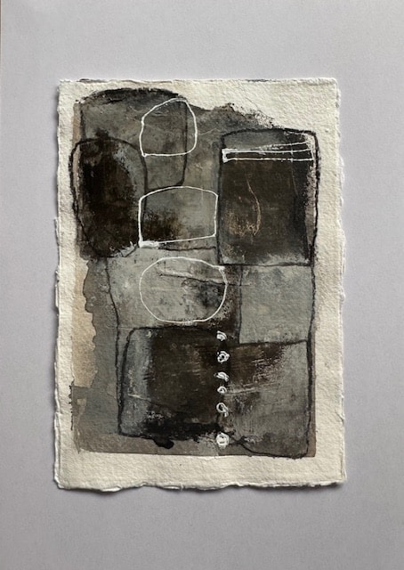 The size of the artwork is A5 (14,8 x 21cm.) and it’s made with acrylic paint and ink and old paper on cotton paper. The colours are taupe-brown and greyish.