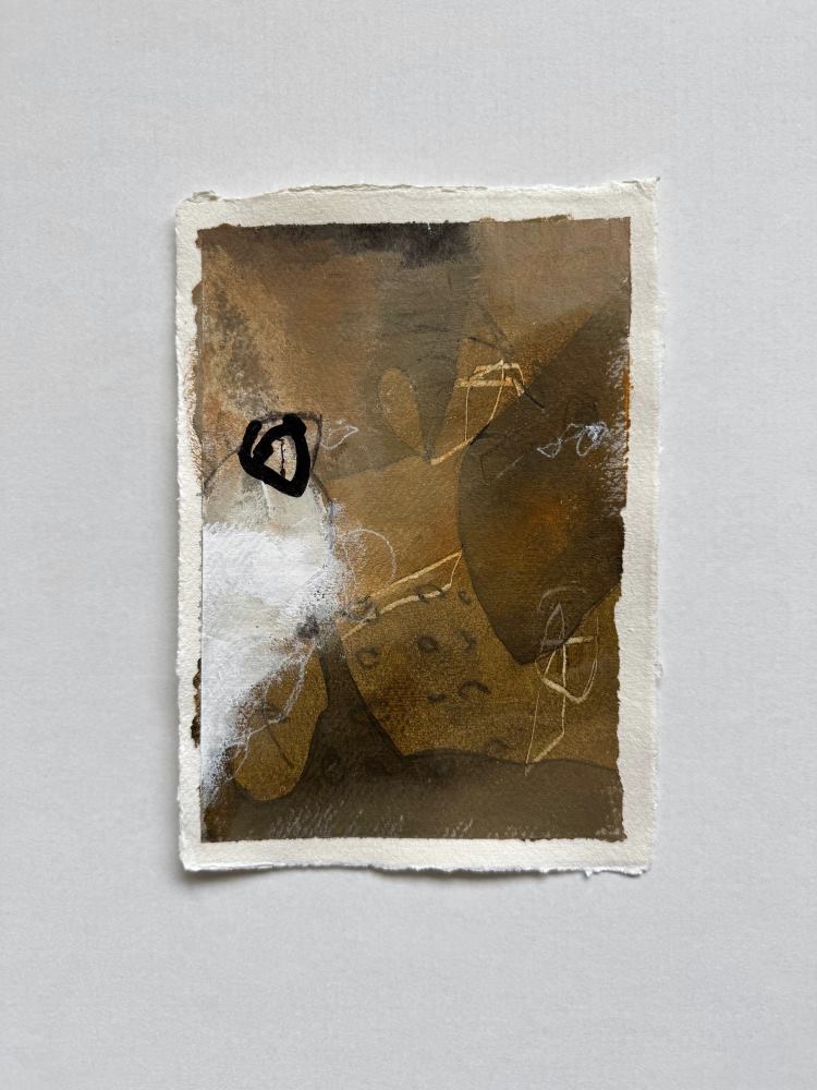 The size of the artwork is A5 (14,8 x 21cm.) and it’s made with acrylic paint and ink and old paper on cotton paper. The colours are taupe-brown and greyish.
