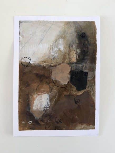 The size of the artwork is A4 (21 x 29,7cm.) and it’s made with acrylic paint and ink and old paper on paper. The colours are taupe-brown and greyish.